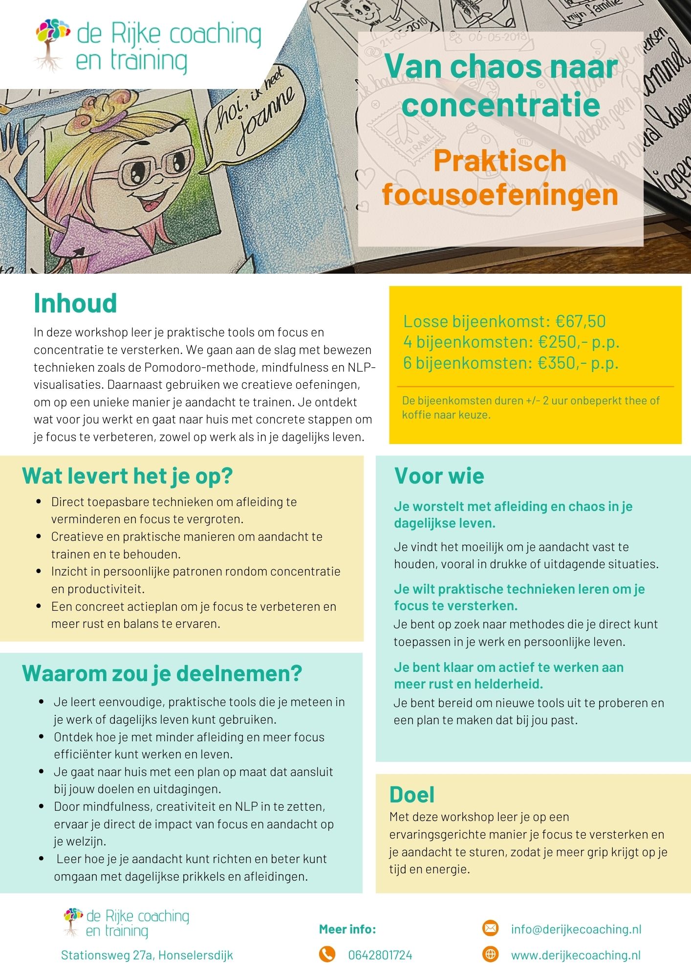 Bij de workshops krijg je de mogelijkheid om zowel losse bijeenkomsten te volgen als een pakket te kiezen. Kies de optie die het beste bij jou past!